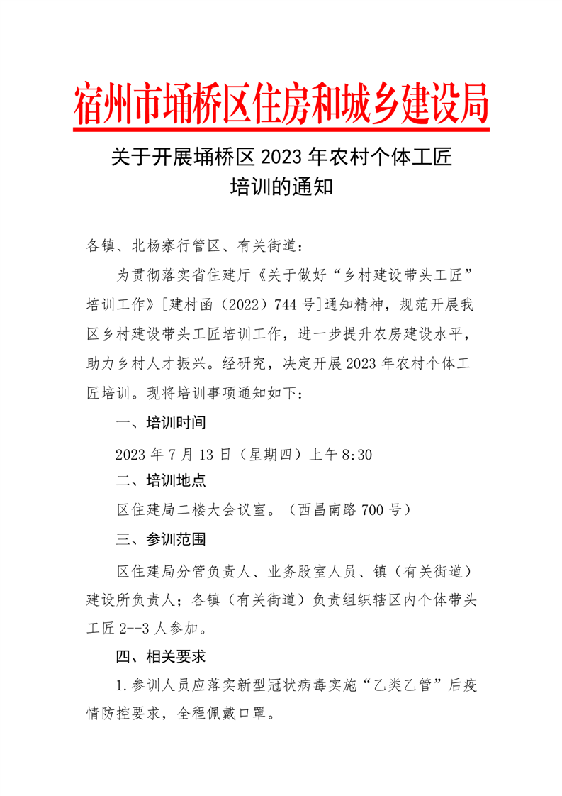 关于开展埇桥区2023年农村个体工匠培训的通知