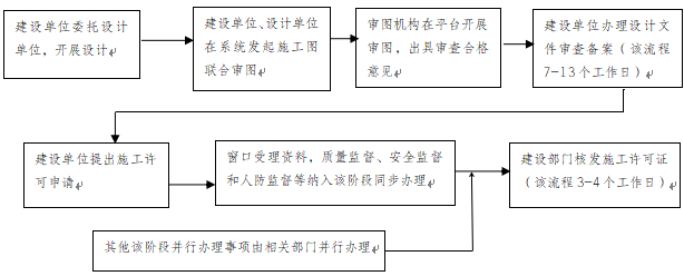 2、审批事项时限:政府投资房屋建筑类、政府投资线性工程类施工图设计文件审查13个工作日(一般工程不超过10个工作日),一般社会投资类、小型社会投资类、带方案出让土地类施工图设计文件审查7个工作日,施工许可证核发3个工作日;其他审批事项在施工许可阶段并行或并联办理。
