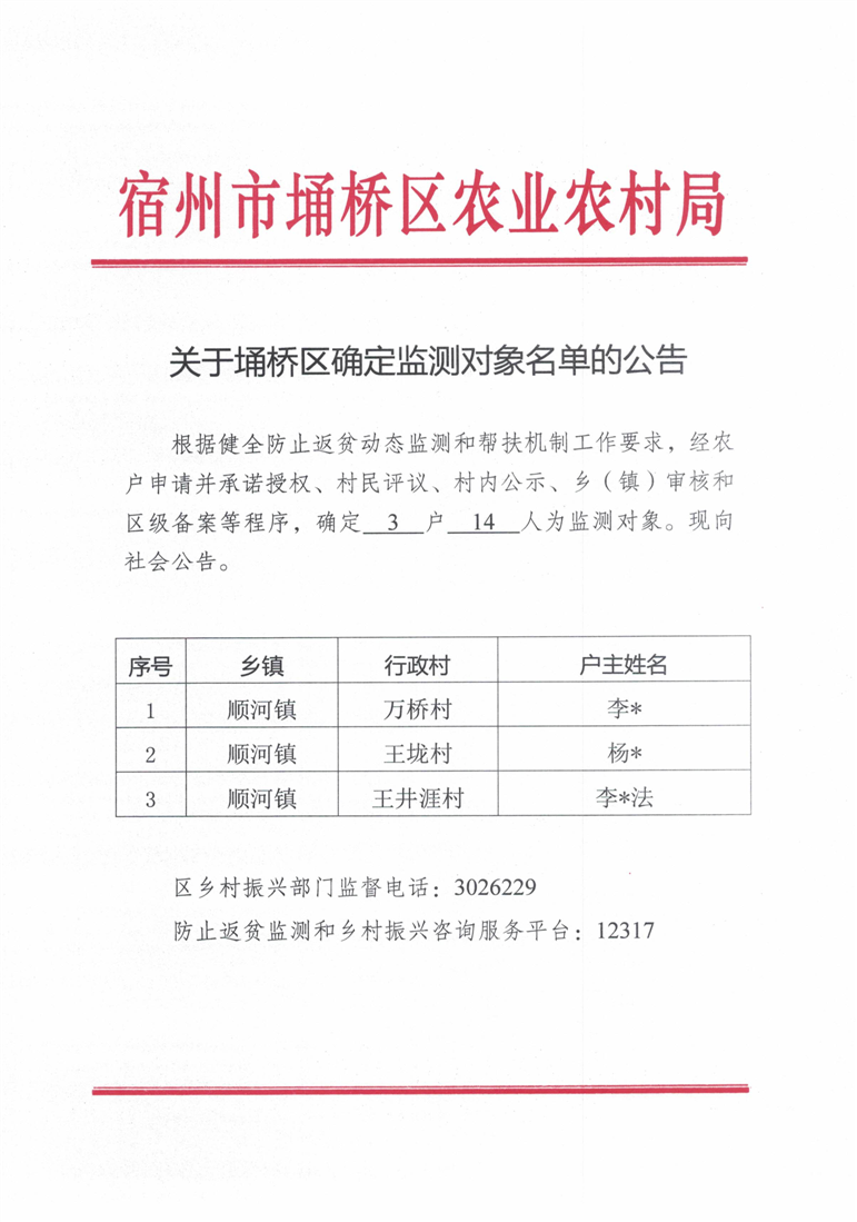 关于埇桥区确定监测对象名单的公告