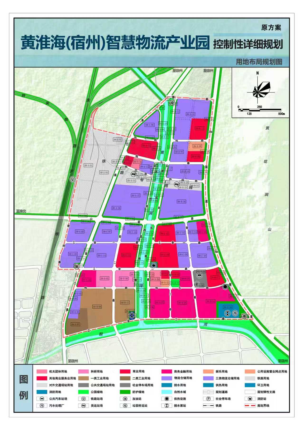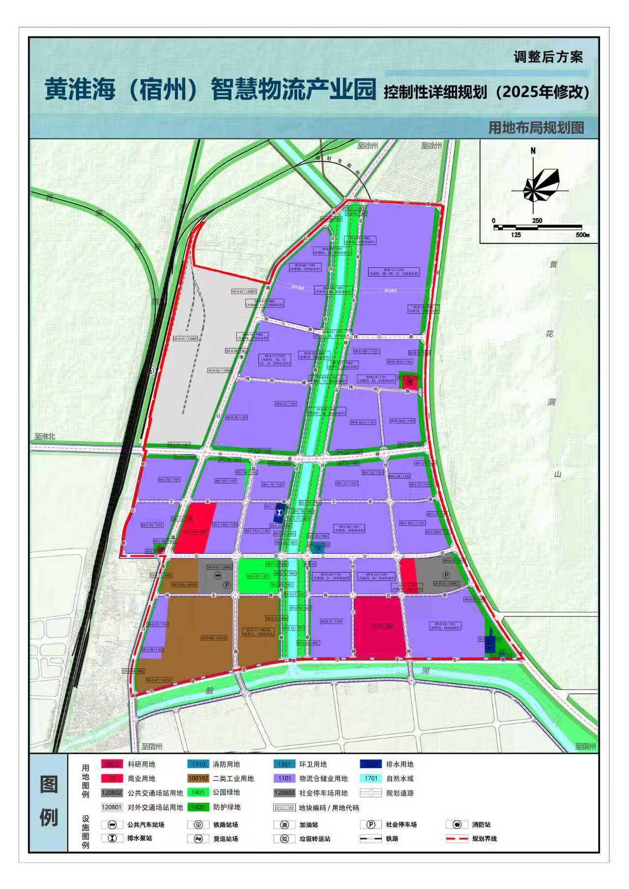 修改原因:为落实符离镇国土空间总体规划的新定位,响应物流产业高质量发展要求,本次调整主要基于两方面原因:一是优化园区功能,通过整合分散的商业用地为连片的物流与工业用地,以提升产业承载力和集约化水平;二是补齐安全短板,依据50年一遇防洪标准,优化排水设施布局,解决园区内涝风险,增强防灾韧性,保障园区安全可持续发展。现特申请对09-A-06、09-A-07、09-A-12、09-A-13等地块性质及用地布局、纬二路、纬三路、纬四路等道路进行调整。