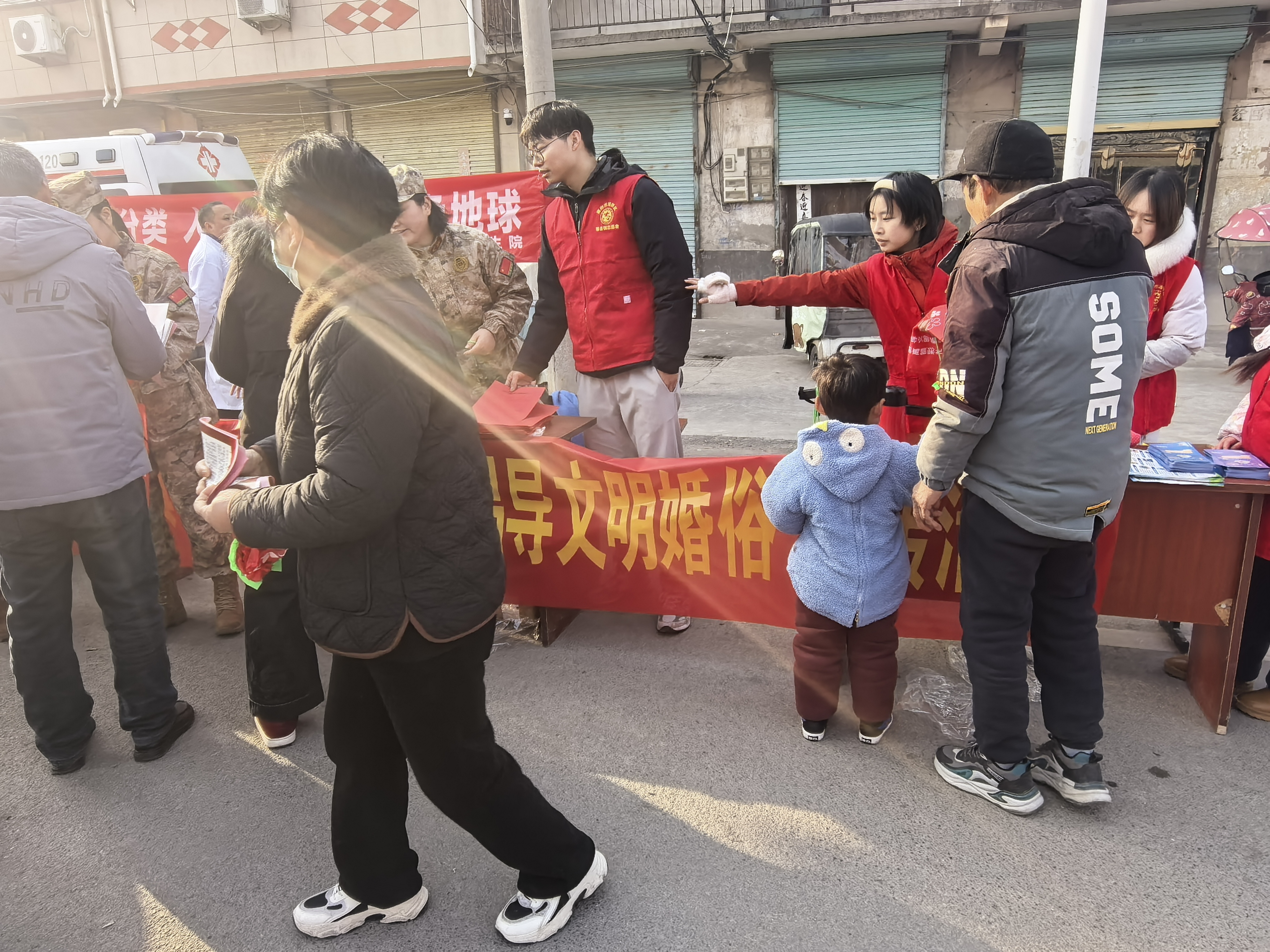 2026 年 2 月 11 日上午,蕲县镇在大集主会场开展 “年味大集・热闹迎新春” 新春便民活动,营造浓厚节日氛围,丰富群众精神文化生活。活动以年味大集为载体,现场设置非遗手工作品展,增添新春气息。工作人员通过悬挂横幅、发放宣传页、现场讲解等方式,普及道路安全、消防安全、文明风俗、禁毒铲毒等知识。同时组织医护人员开展义诊服务,为群众提供健康问诊、血压测量、健康指导,把便民服务送到群众身边。此次活动集年味、宣传、服务于一体,既活跃了节日氛围,又切实为群众办实事,得到群众一致好评。