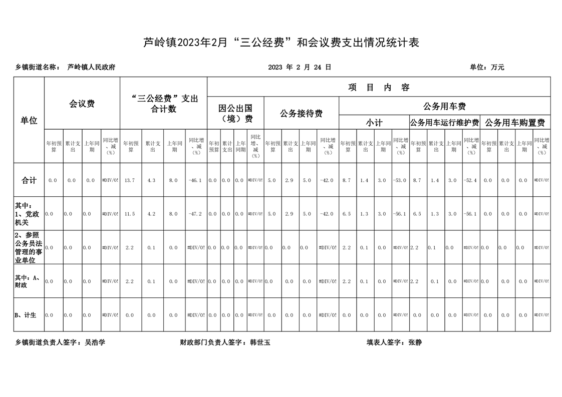 芦岭镇2023年2月“三公经费”和会议费支出情况统计表