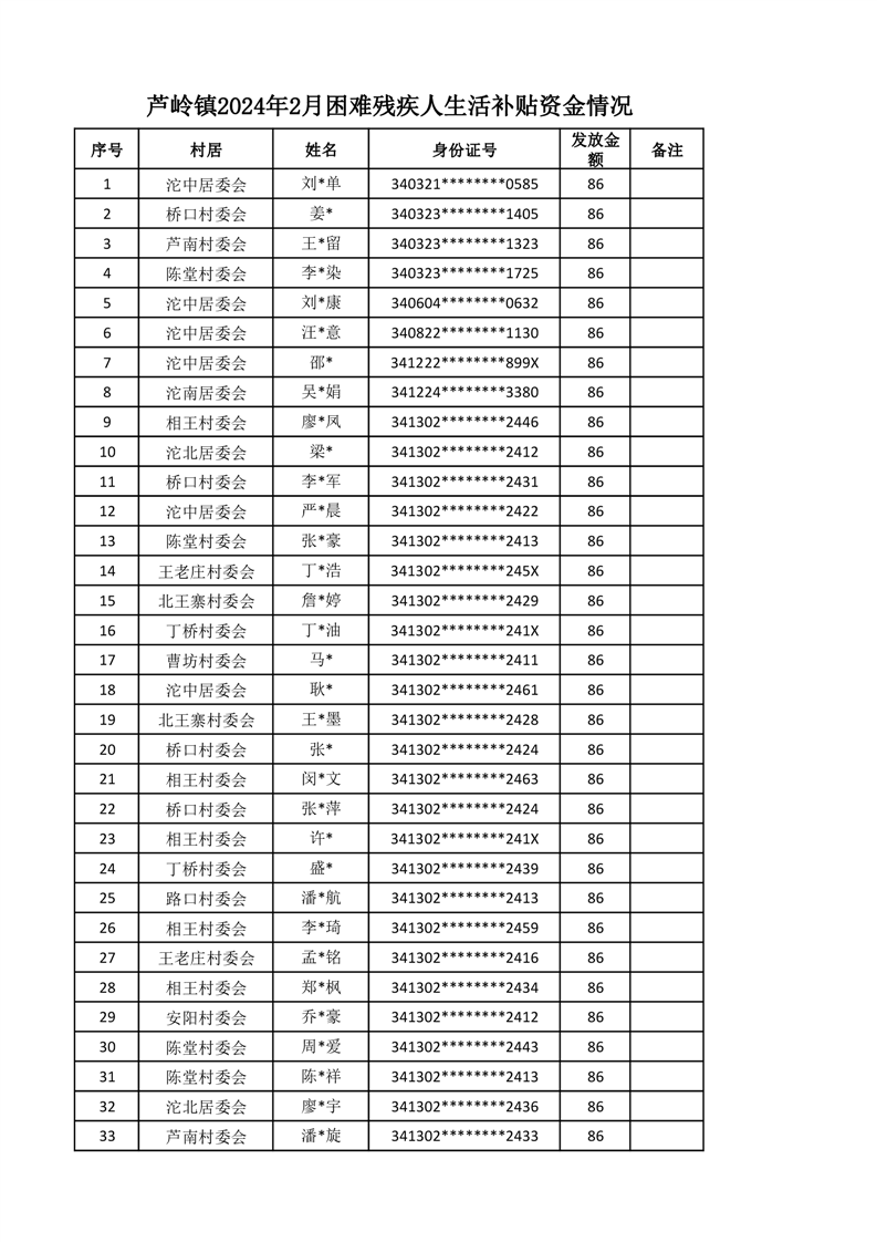 芦岭镇2024年2月困难残疾人生活补贴资金情况