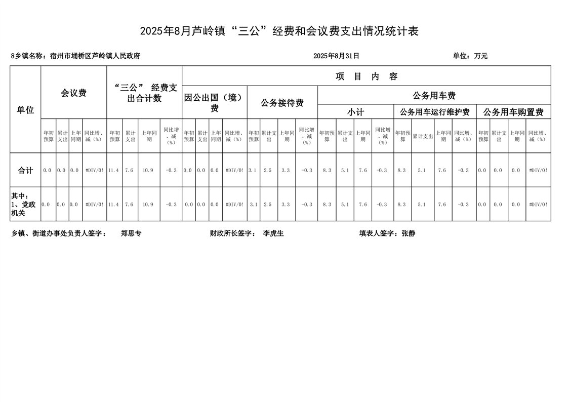 芦岭镇2025年8月“三公”经费和会议费支出情况统计表
