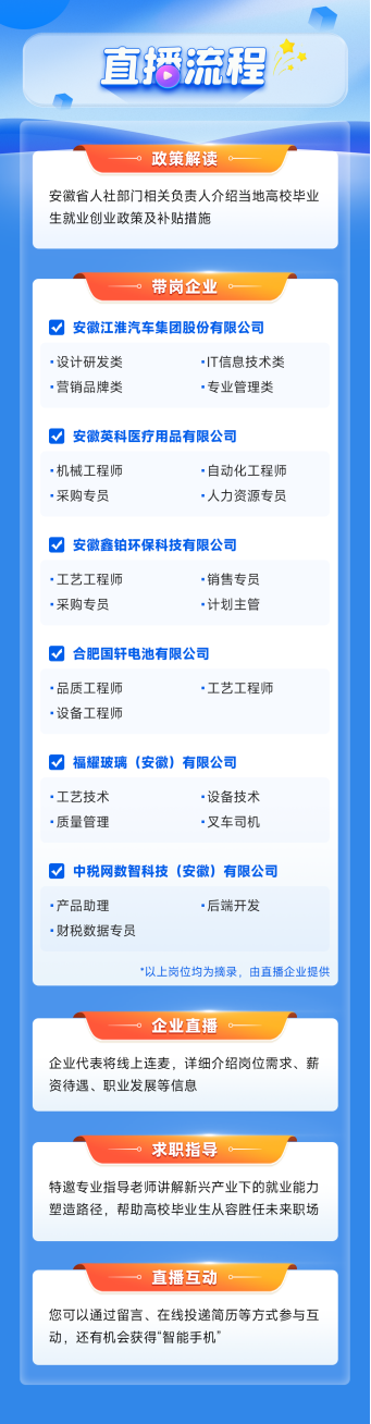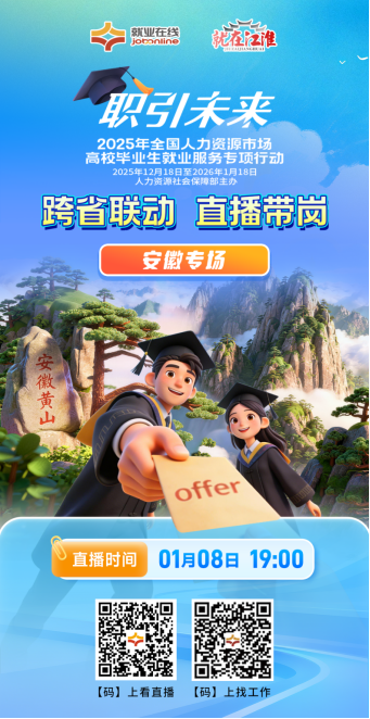 岁末辞旧,职启新程,求职正当时!为助力广大高校毕业生把握就业机遇,顺利开启职业征程,“就业在线”平台开展“职引未来——全国人力资源市场高校毕业生就业服务专项行动”专场系列直播带岗活动。1月8日19:00,“就业在线”将联合安徽省人力资源和社会保障厅开展安徽专场直播带岗,通过权威政策解读、优质岗位推荐和专业求职指导,为莘莘学子精准赋能,护航就业求职路!