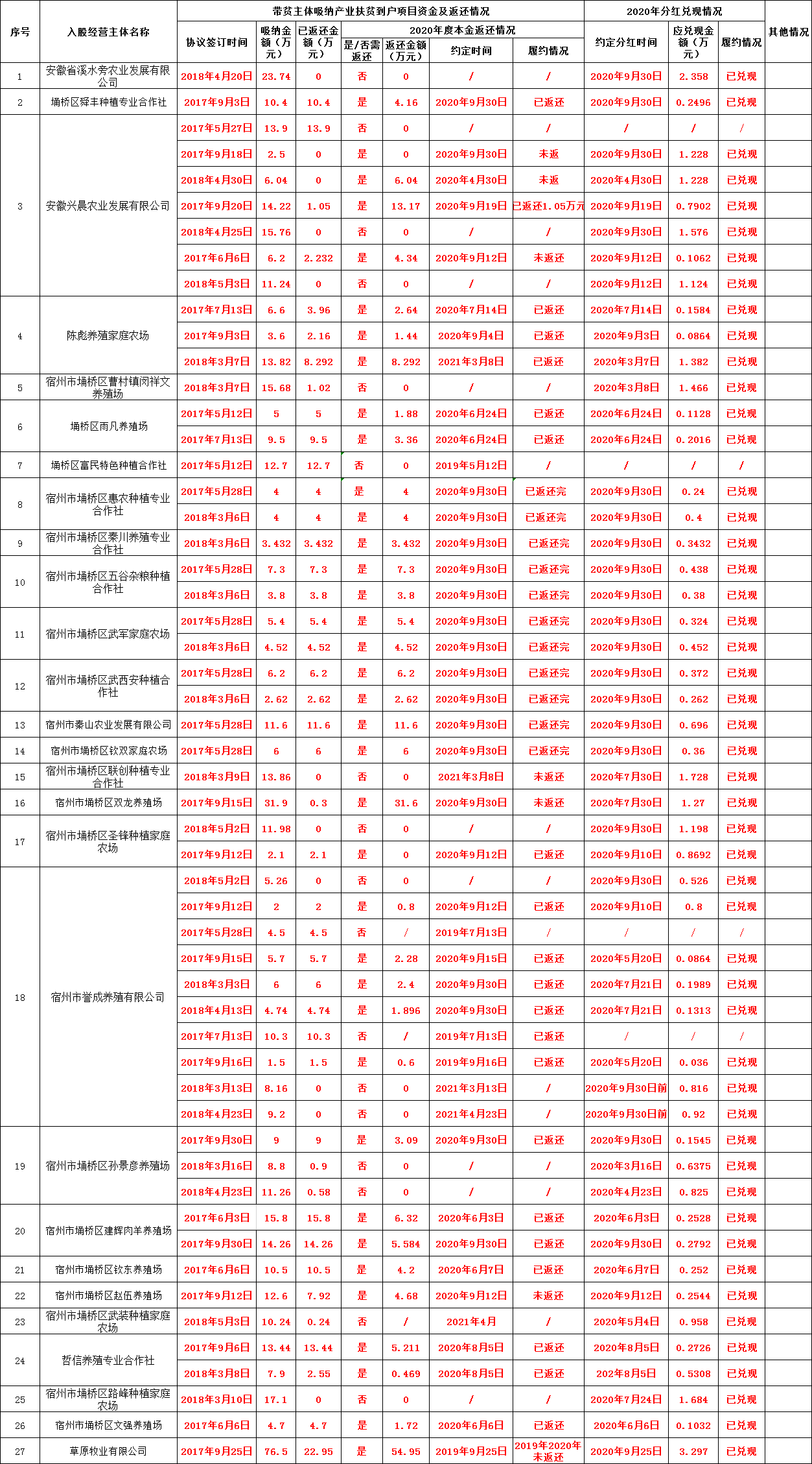 产业扶贫资金收益:曹村镇2020年度产业扶贫到户入股项目协议履行情况统计表