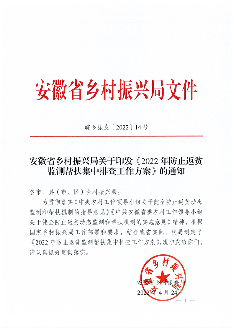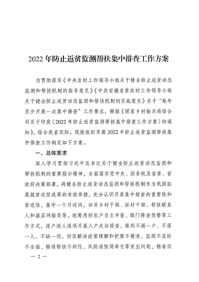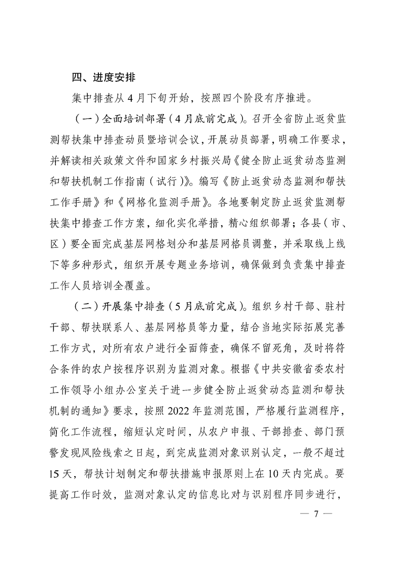 安徽省乡村振兴局关于印发《2022年防止返贫监测帮扶集中排查工作方案》的通知