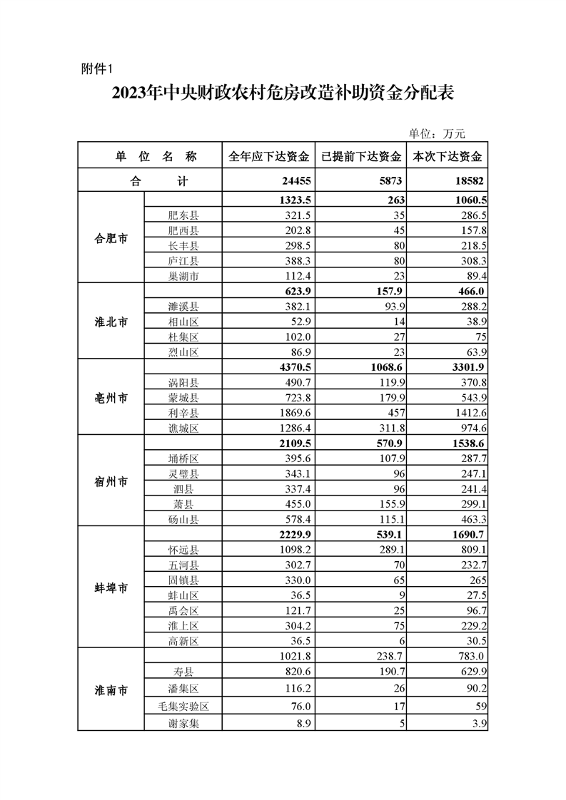 【政策文件】安徽省财政厅安徽省住房和城乡建设厅关于下达2023年中央财政农村危房改造补助资金的通知