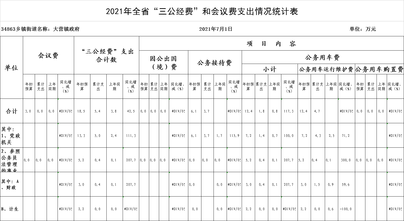 2021年6月份大营镇“三公”经费和会议费支出情况统计表