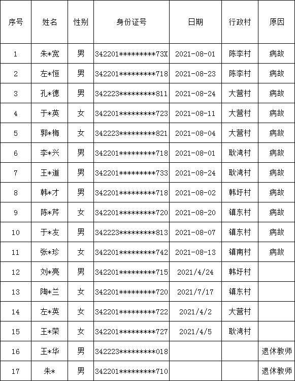 农村居民养老保险注销:大营镇8月份农村居民养老保险注销人员花名册