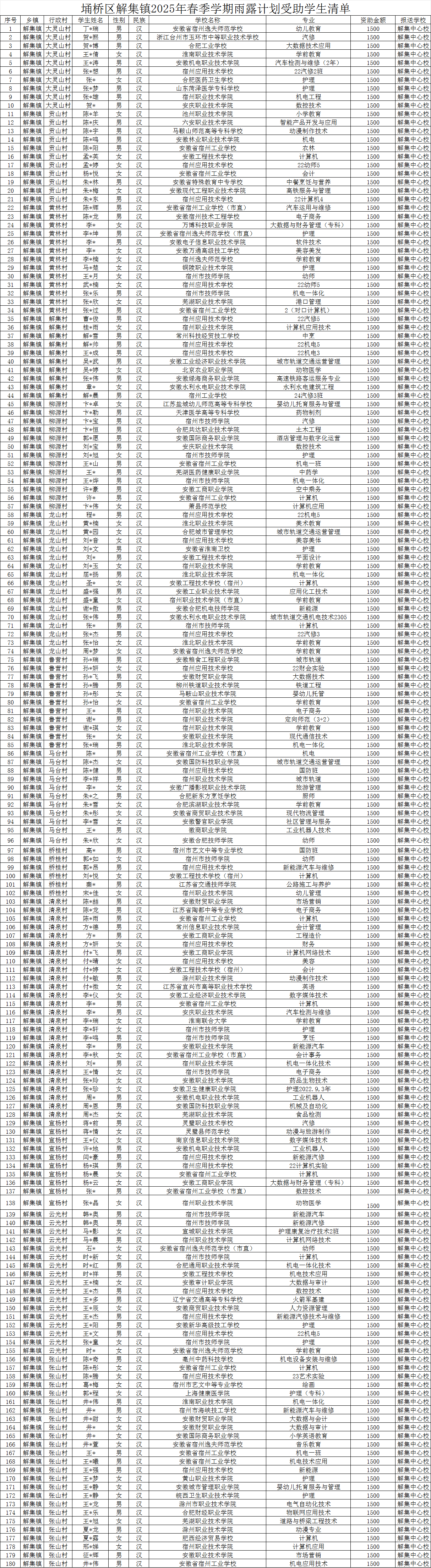 埇桥区解集镇2025年春季学期雨露计划受助学生清单