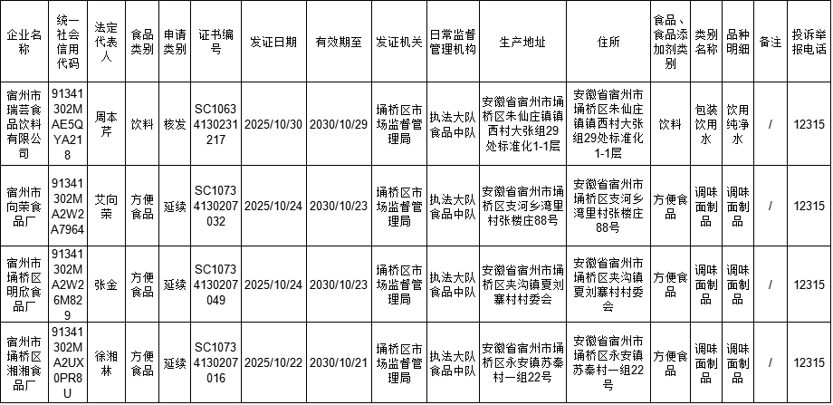 埇桥区市场监督管理局2025年10月份食品生产许可公示