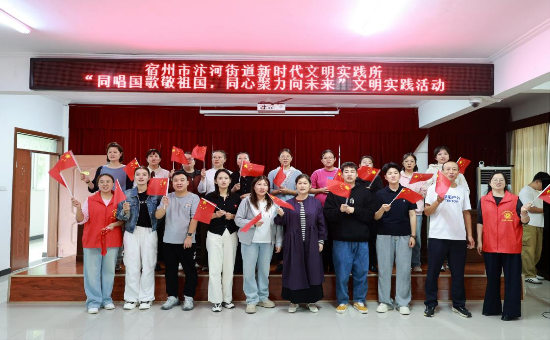 金秋时节,喜迎国庆。为热烈庆祝中华人民共和国成立76周年,丰富职工的精神文化生活,2025年10月1日,宿州市埇桥区汴河街道新时代文明实践所组织街道全体职工在街道会议开展“同唱国歌敬祖国 同心聚力向未来”文化活动。