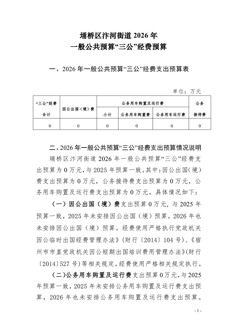 【年度决算】宿州市埇桥区汴河街道办事处2026年一般公共预算“三公”经费预算