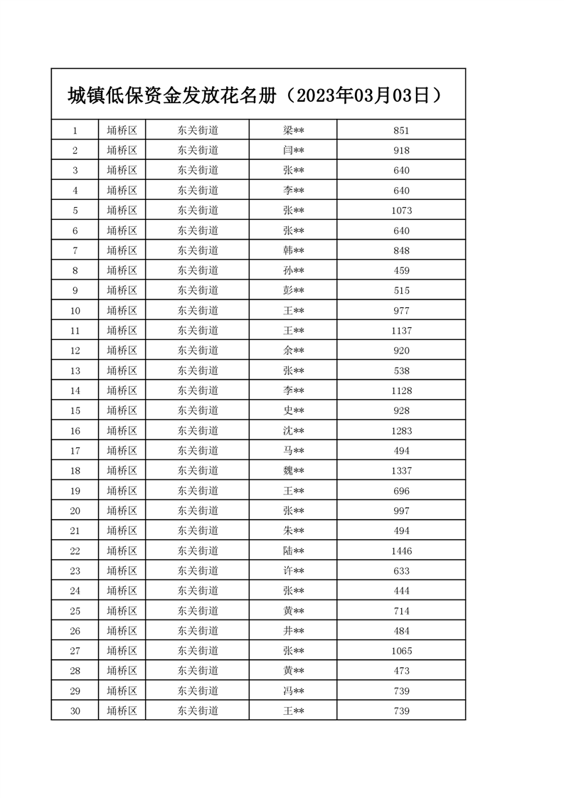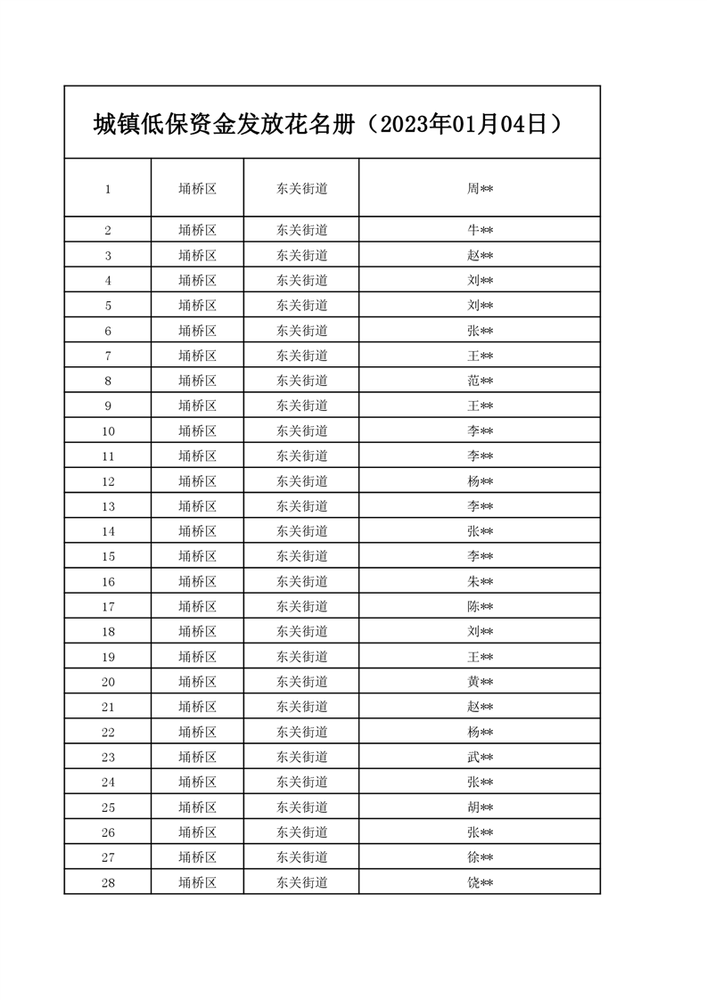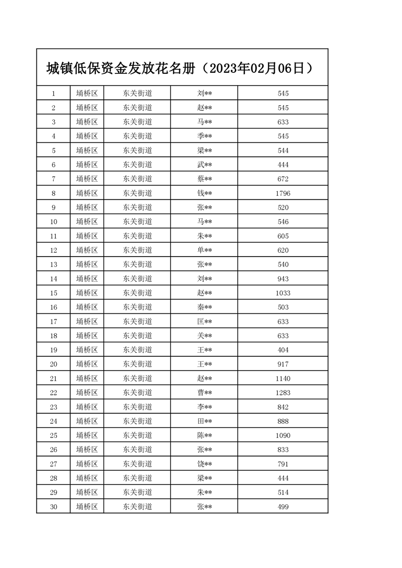 【城乡低保】东关街道2023年第一季度城乡低保发放花名册