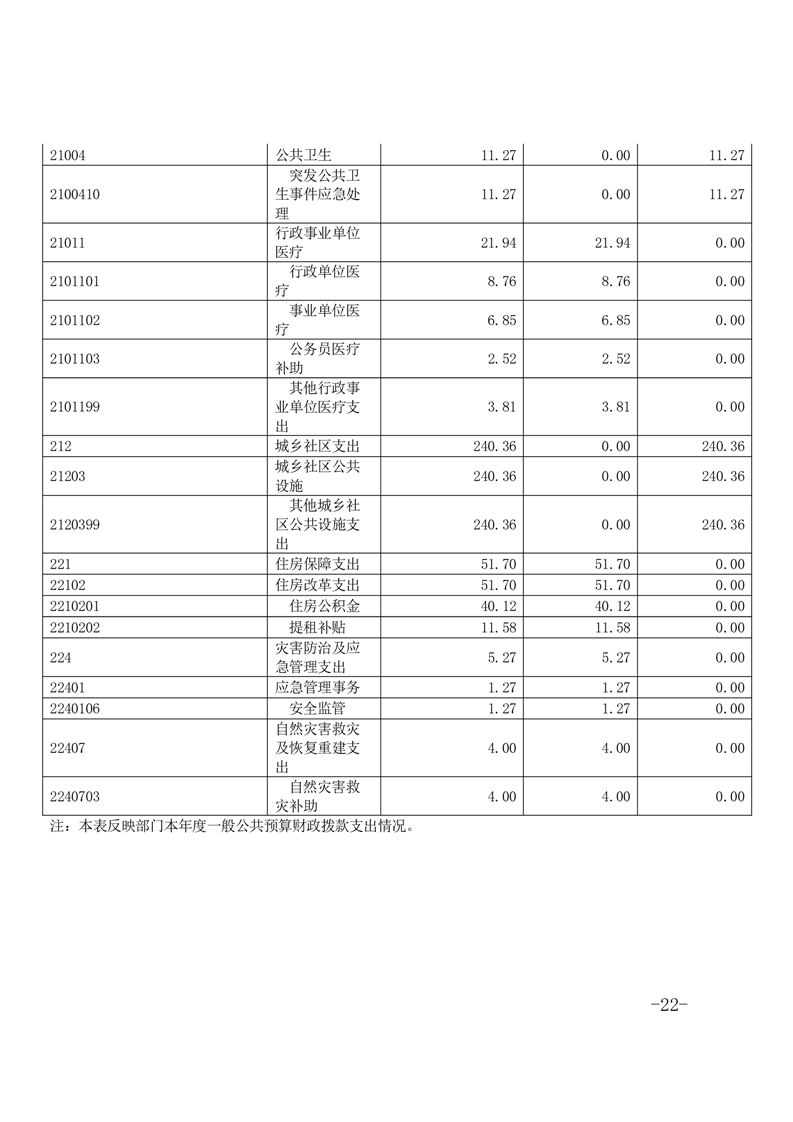 2022年度一般公共预算财政拨款支出1367.13万元,主要用于以下方面:一般公共服务支出(类)729.41万元,占53.35%;国防支出(类)0.20万元,占0.01%;文化旅游体育与传媒支出(类)1.59万元,占0.12%;社会保障和就业支出(类)305.38万元,占22.34%;卫生健康支出(类)33.21万元,占2.43%;城乡社区支出(类)240.36万元,占17.58%;住房保障支出(类)51.70万元,占3.78%;灾害防治及应急管理支出(类)5.27万元,占0.39%。