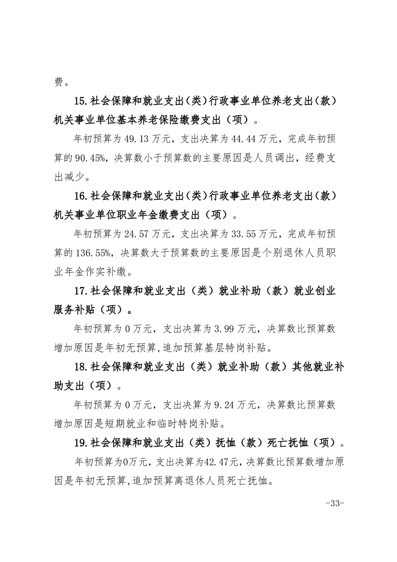 年初预算为24.57万元,支出决算为33.55万元,完成年初预算的136.55%,决算数大于预算数的主要原因是个别退休人员职业年金作实补缴。