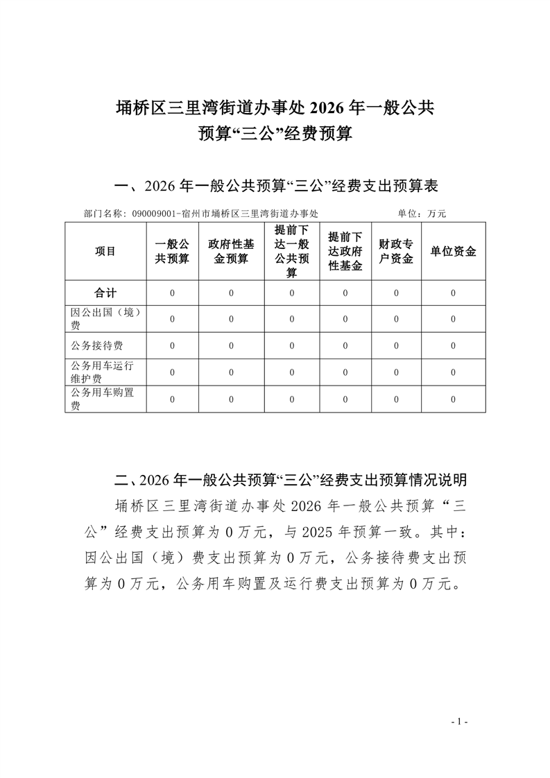 宿州市埇桥区三里湾街道办事处2026年度一般公共预算财政拨款“三公”经费支出预算