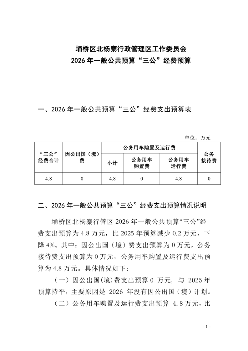 埇桥区北杨寨行管区工作委员会2026年“三公”经费预算公开