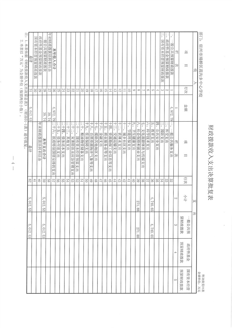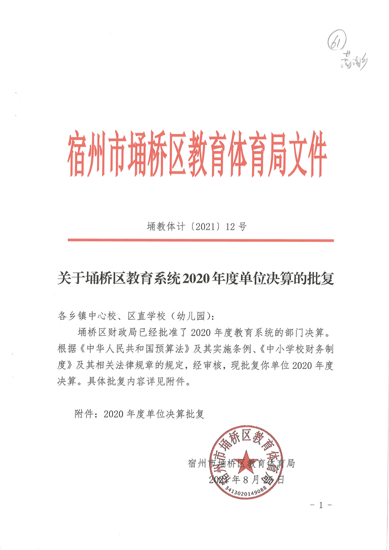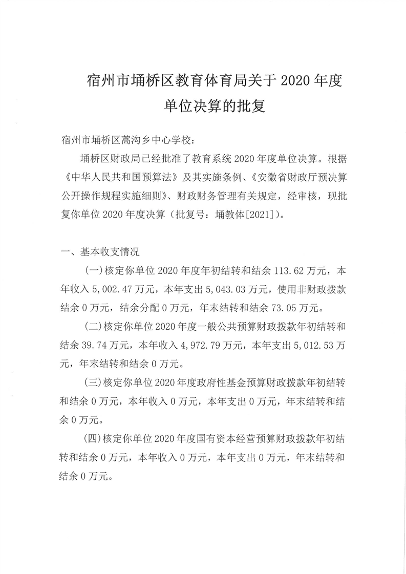 关于埇桥区教育系统2020年度单位决算的批复(蒿沟中心校)