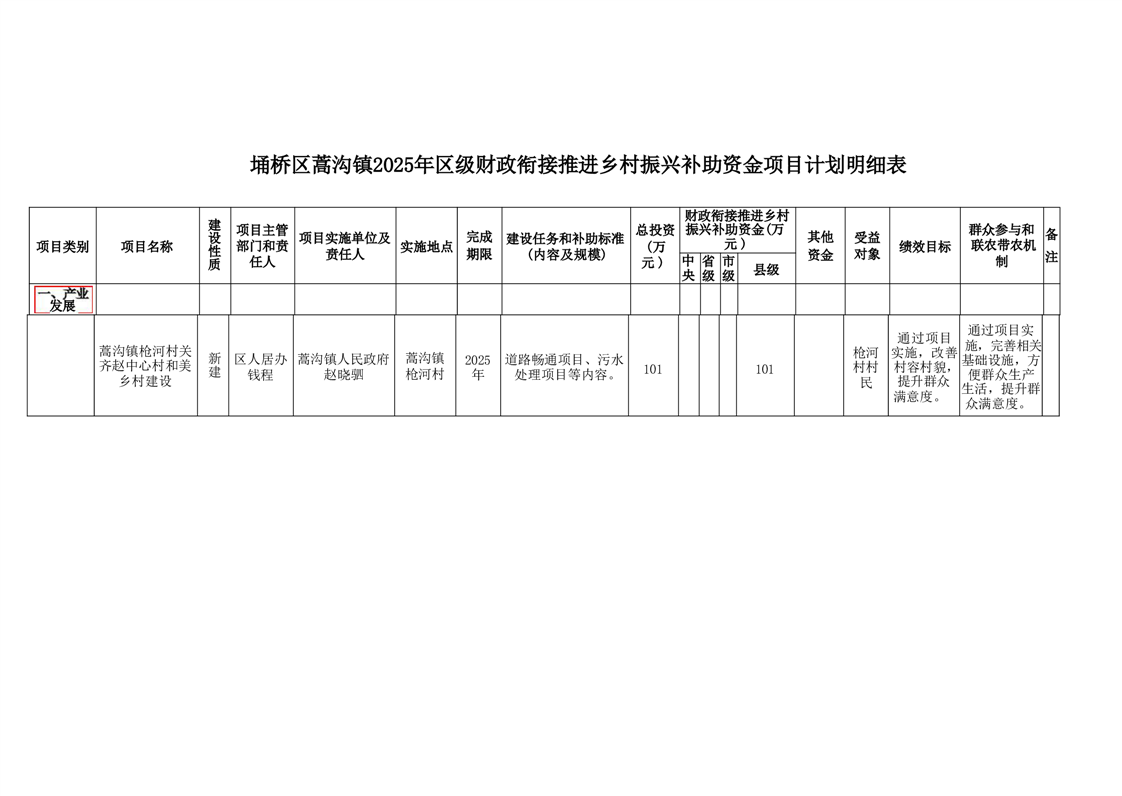 蒿沟镇2025年财政衔接推进乡村振兴补助资金项目计划安排情况