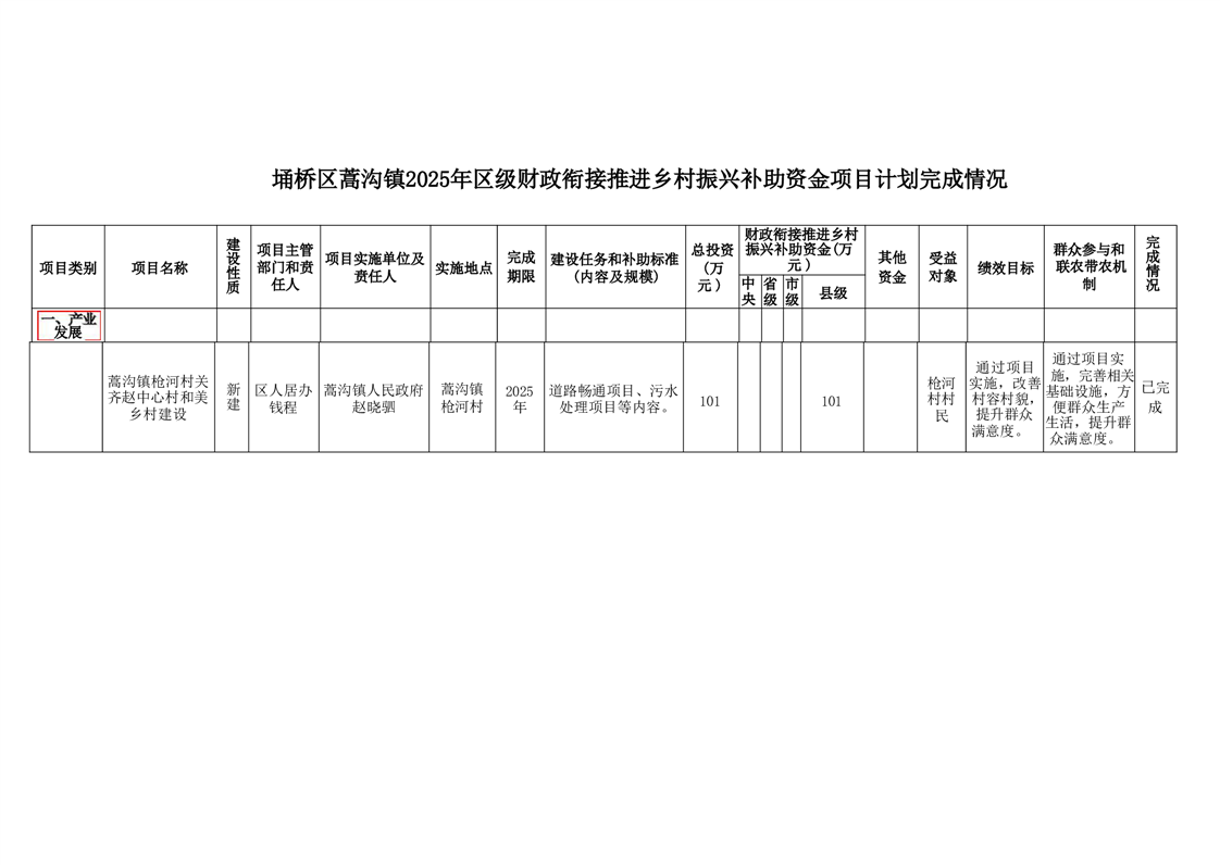 蒿沟镇2025年财政衔接推进乡村振兴补助资金项目计划完成情况