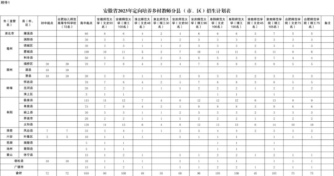 附件:1.安徽省2023年定向培养乡村教师培养院校分县(市、区)招生计划