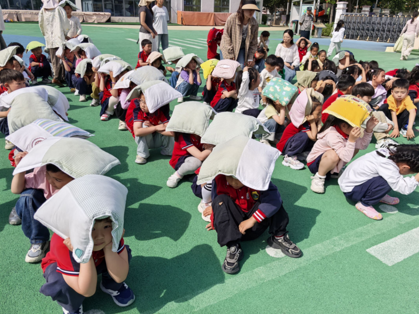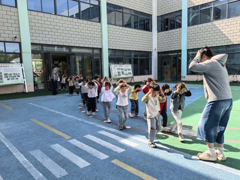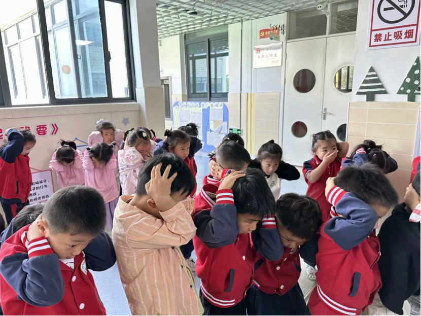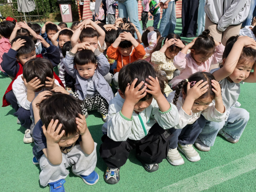 下午3:00,警报声响起,演练正式开始。班级教师立即指挥幼儿就近躲在课桌下、墙角处,双手护头,身体蜷缩。约2分钟“地震波减弱”后,疏散指令下达,幼儿在教师带领下弯腰低姿,按预定路线快速撤离教室。楼道引导员全程引导,提醒“不推挤、不喧哗”。仅用时3分10秒,全体师生安全集结至操场空旷区域。各班教师当场清点人数并上报,演练全程紧张有序,无拥挤、踩踏情况。