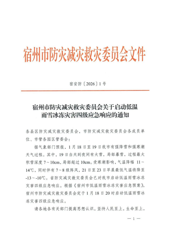 宿州市防灾减灾救灾委员会关于启动低温雨雪冰冻灾害四级应急响应的通知