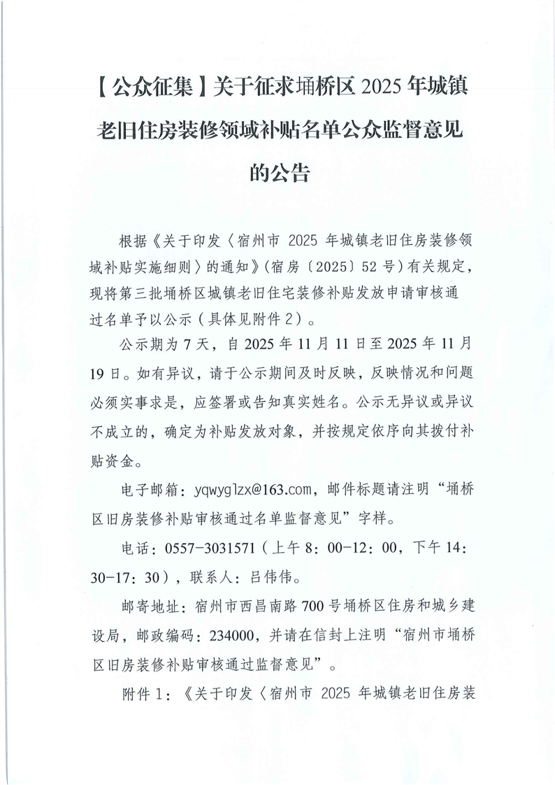 | 名称: | 【公众征集】关于征求埇桥区2025年城镇老旧住房装修领域补贴名单公众监督意见的公告 | ||