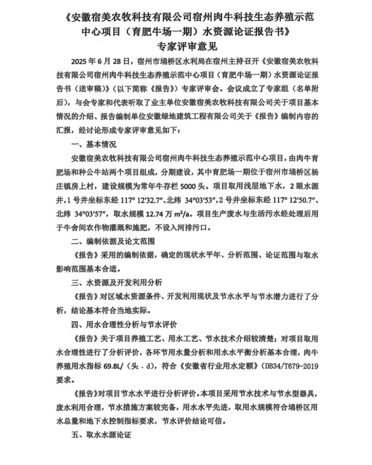 附件:《安徽宿美农牧科技有限公司宿州肉牛科技生态养殖示范中心项目(育肥牛场一期)水资源论证报告书》专家评审意见