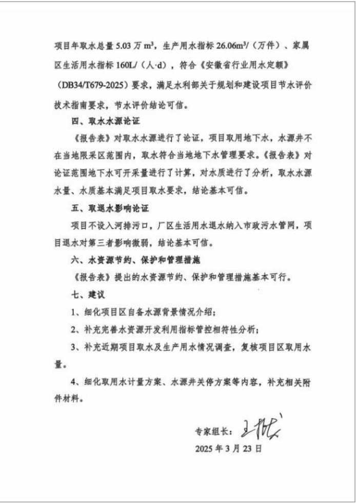 四、你单位应加强地下水管理和保护,严格落实地下水管控指标要求。项目不设入河排污口,项目生产无退水,生活污水经化粪池处理达标后通过市政污水管网排入宿州市汴北污水处理厂。条件具备时,项目用水应接入公共管网,并依法封闭自备水源井。