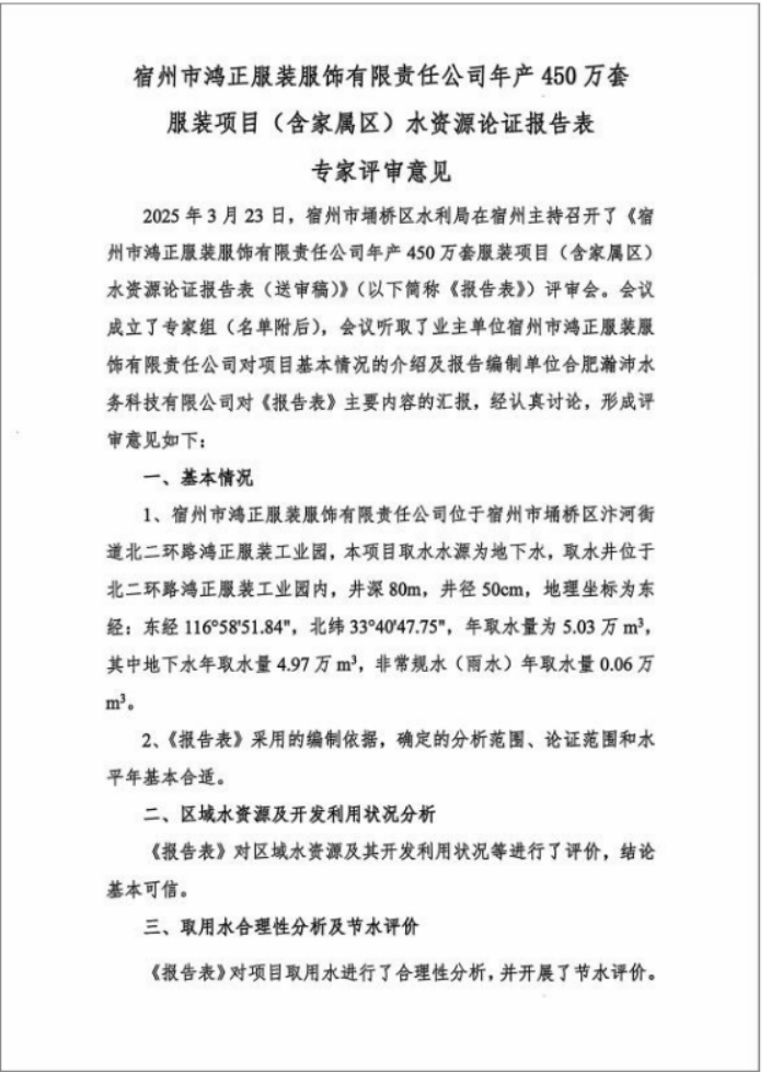 附件:《宿州市鸿正服装服饰有限责任公司年产450万套服装项目(含家属区)水资源论证报告表》专家评审意见