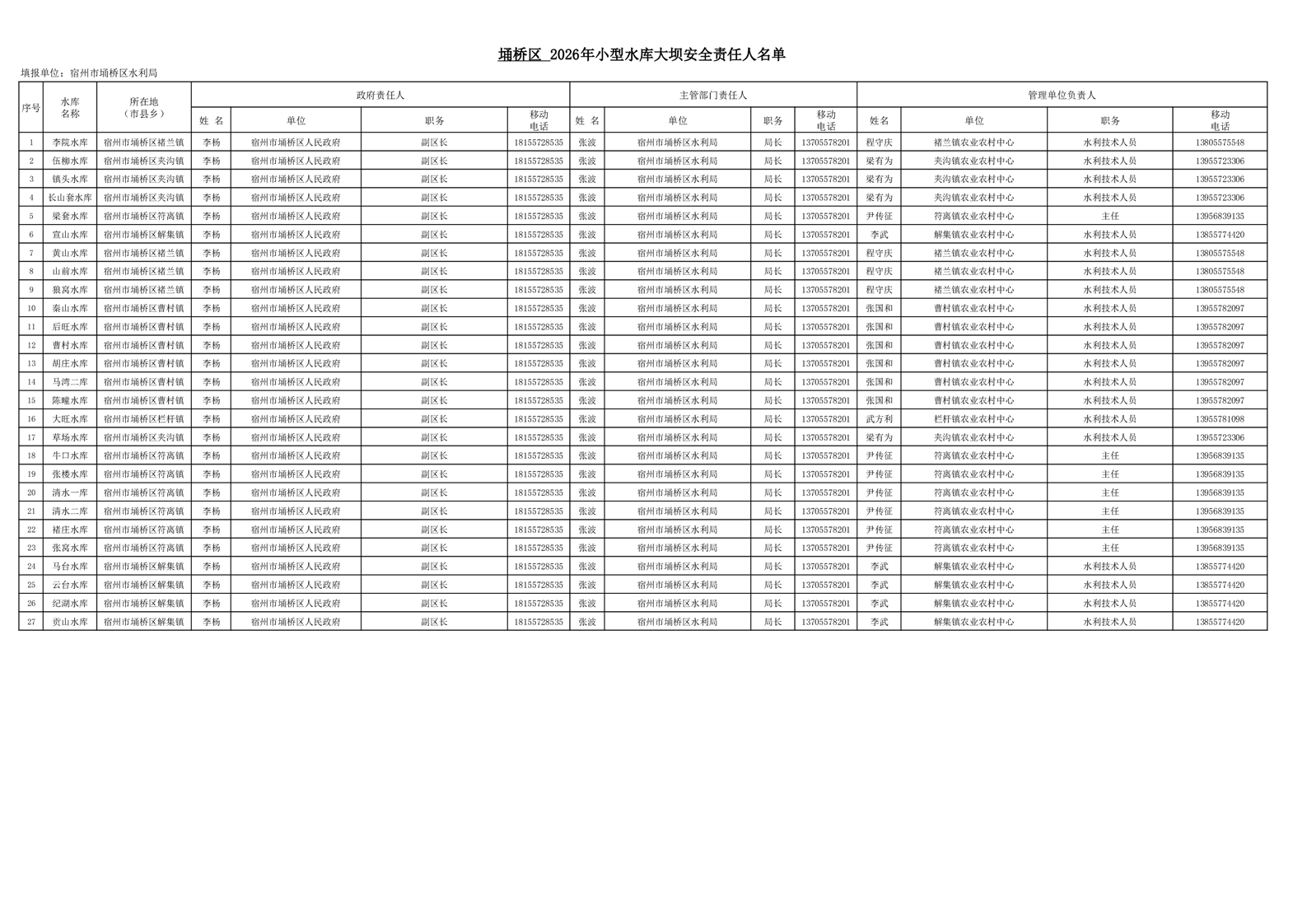 宿州市埇桥区2026年小型水库大坝安全责任人名单