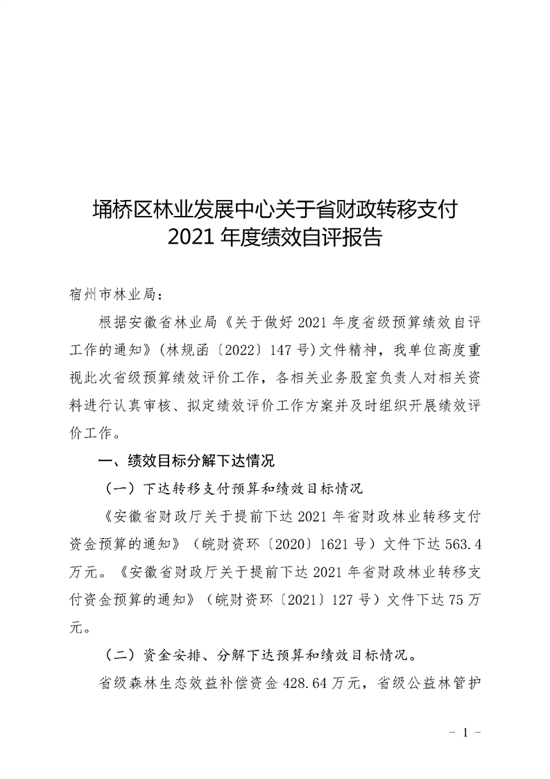 | 名称: | 埇桥区林业发展中心关于省财政转移支付2021年度绩效自评报告 | ||