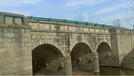 该桥为三孔石桥,桥长约33米、形制简洁实用,结构上采用石砌拱券工艺,以规整石块错缝砌筑成三个连续拱洞,桥墩为石砌实体结构,依托拱券力学实现承重;桥身主体为石材(表面呈自然风化质感),配石质护栏(由栏板、望柱组成,部分栏板带有刻字痕迹);现桥面后期加装了金属防护栏,兼顾传统结构与现代通行防护;整体适配乡村沟渠的水利与小型交通需求,风格简易实用,是当地乡村基础设施中兼具通行、排水功能的石砌桥梁。