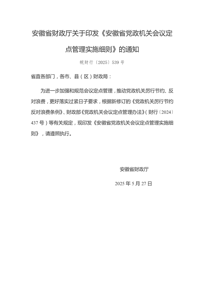 | 名称: | 安徽省财政厅关于印发《安徽省党政机关会议定点管理实施细则》的通知 | ||