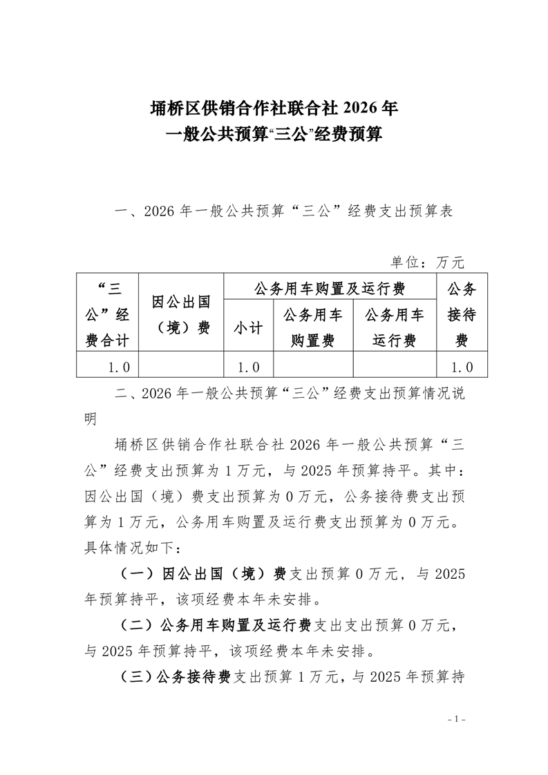 | 名称: | 【年度经费预算及说明】埇桥区供销合作社联合社2026年一般公共预算“三公”经费预算 | ||