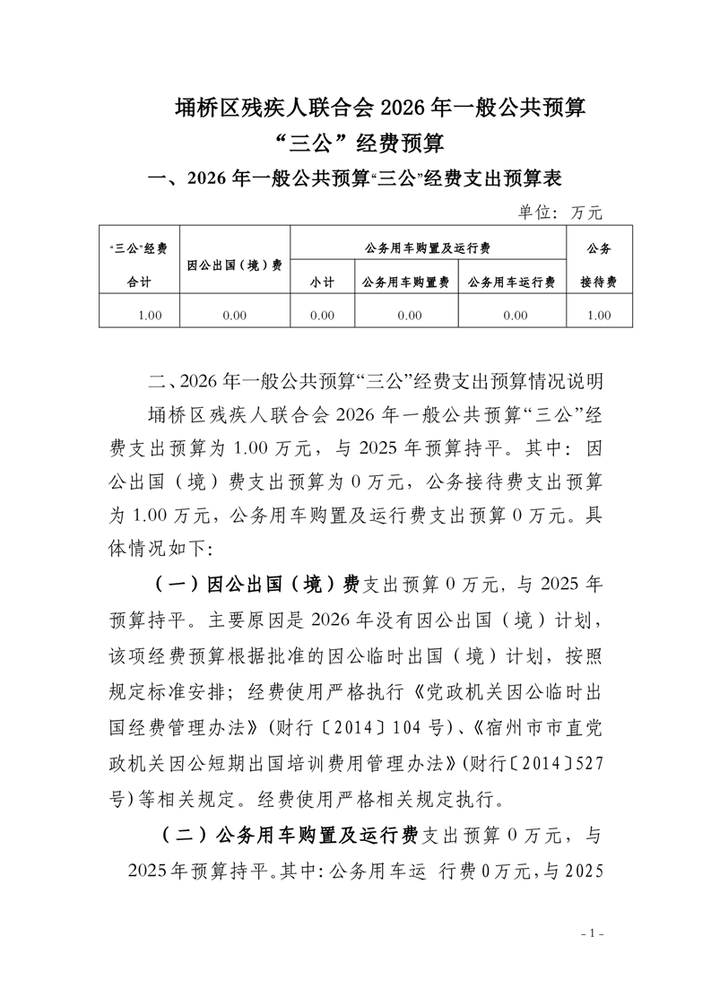 | 名称: | 埇桥区残疾人联合会2026年一般公共预算“三公”经费预算(本级) | ||