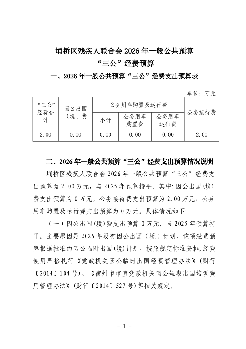 | 名称: | 埇桥区残疾人联合会2026年一般公共预算“三公”经费预算(部门) | ||