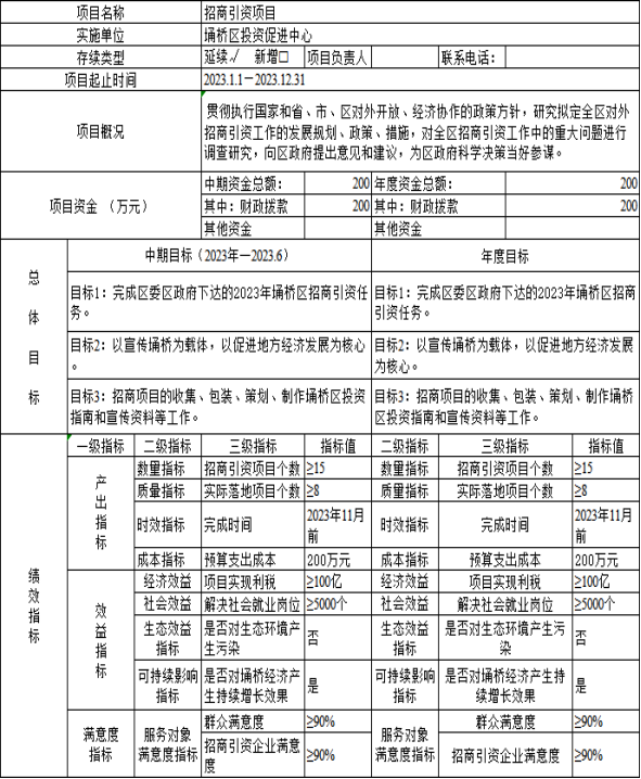 (4)项目绩效目标:完成区委区政府下达的2023年埇桥区招商引资任务。以宣传埇桥为载体,以促进地方经济发展为核心。招商项目的收集、包装、策划、制作埇桥区投资指南和宣传资料等工作。