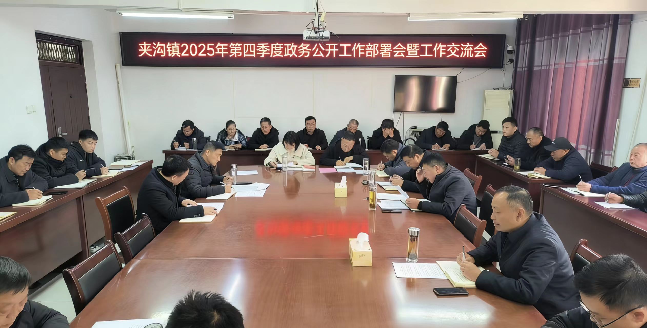 2025年12月15日,夹沟镇在镇政府三楼会议室召开2025年第四季度政务公开业务交流培训会,镇党委书记张军同志主持会议,分管负责人、各相关站所负责人、村(居)负责人参加会议。