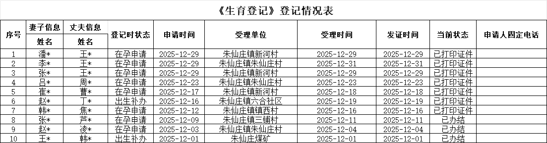 朱仙庄镇2025年12月份《生育登记》登记情况表