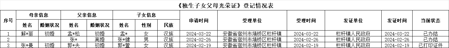 | 名称: | 行政确认:栏杆镇2024年第一季度独生子女父母光荣证登记情况表 | ||