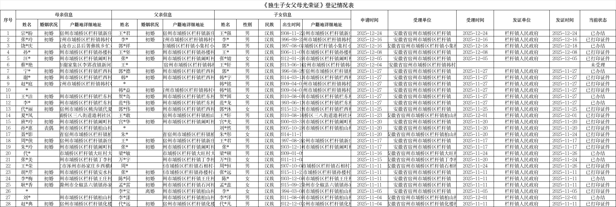 | 名称: | 行政确认:栏杆镇2025年第四季度独生子女父母光荣证登记情况表 | ||
