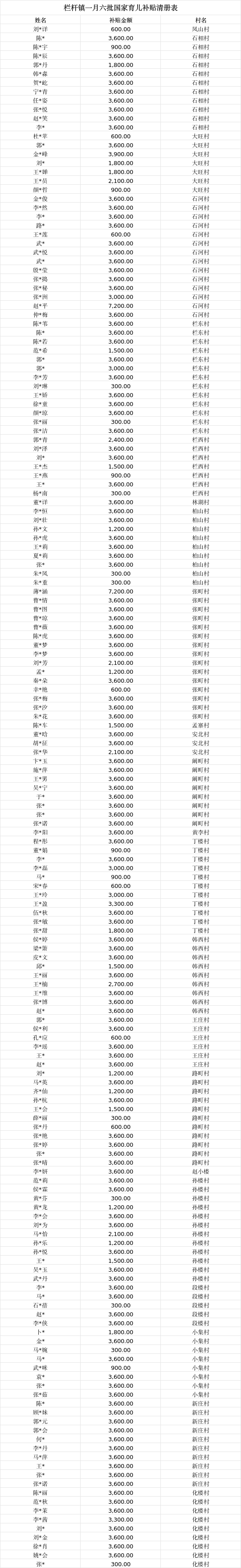 2026年1月栏杆镇发放国家育儿补贴共173人、513000元;均已完成打卡发放到个人账户。