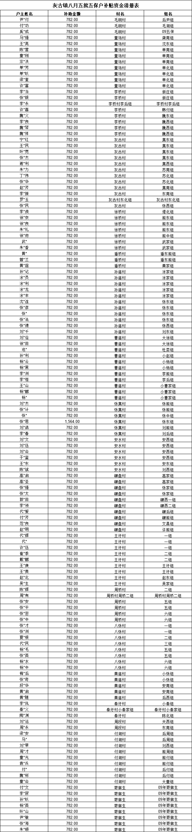 2025年灰古镇八月五批五保户补助136人、107134元;均已完成打卡发放到个人账户。具体明细信息已在村公示栏和小微权力平台公开。联系电话:0557-4771003,具体名单如下: