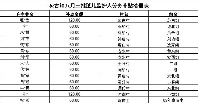 2025年灰古镇八月三批孤儿监护人劳务补贴补助14人、960元;均已完成打卡发放到个人账户。具体明细信息已在村公示栏和小微权力平台公开。联系电话:0557-4771003,具体名单如下:
