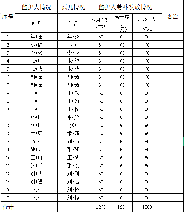 名称: | 【劳务补贴】大营镇2025年8月福利儿童监护人劳务补贴发放情况 | ||