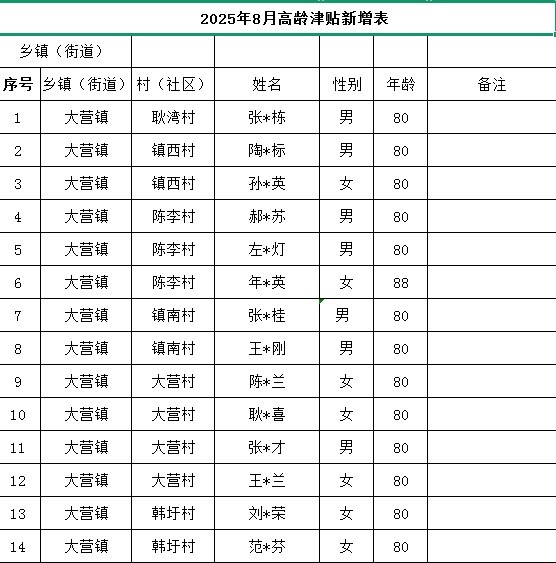 【办理结果】行政确认:大营镇2025年8月高龄津贴新增表